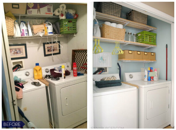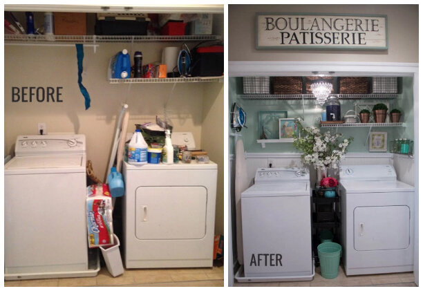 Poté: Byly přidány skladovací koše, ve kterých byly umístěny všechny potřebné předměty. Na spodní polici byla zavěšena barevná ramínka na sušení, která zdobí prádelnu.