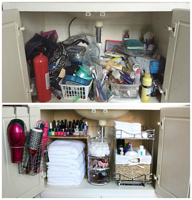 Před: Všechno bylo smíšené: kosmetika, výrobky na úpravu vlasů, sklenici, tašky, zubní kartáčky ve sklenici a dokonce hasicí přístroj.