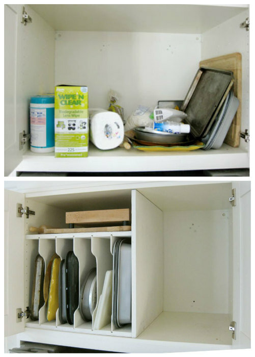 Před: V skříňce byly nejprve uloženy krájecí desky, podnosy, pekáče, váleček. Ale postupem času se na polici objevily další věci.