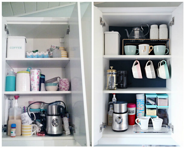 Před: Šálky byly na různých místech. Spodní police byla plná zbytečných věcí a plechovky na kávu a čaj byly nějak ztraceny na pozadí.