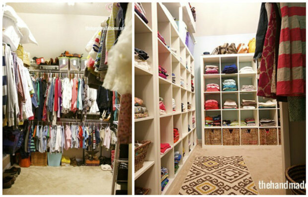 Poté: Police byly připevněný ke stěnám, v nichž byly roztříděny všechny oděvy. Každý člen rodiny má svou vlastní zónu. Spodní prádlo bylo umístěné do uzavřených košů.