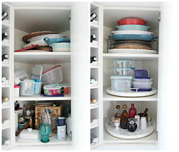 Poté: Na dvě police byly nainstalovány otočné tácy. Všechny sklenice na koření byly úhledně umístěny na prvním úrovni a nádoby byly umístěny na druhé úrovni. Na horní polici postavili pekáče. Všechny zbytečné předměty byli odstraněny. Nyní můžete snadno dostat potřebnou věc a je vidět kde stojí.
