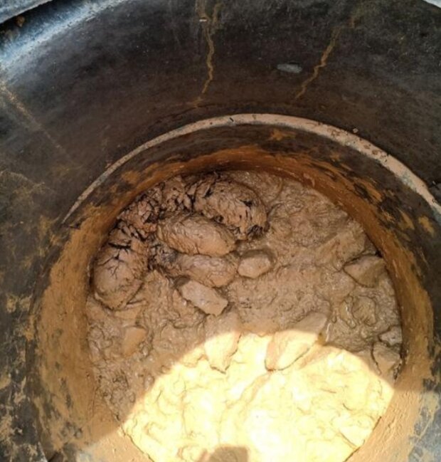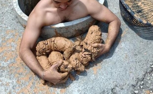 Něco jako fňukání nebo pískání a zvuky přicházely z podzemí. Rozhlédl se a našel jámu v hlubokém bahně na dně se něco ševelilo. A pak se statečný chlap rozhodl zachránit tyto stvoření, ať už je to cokoli!