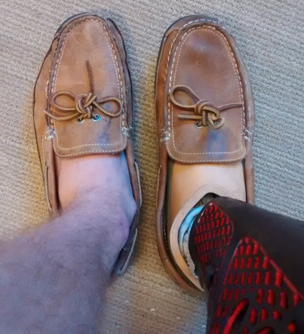 Bota zprava obuta na protéze, která se při chůzi nepohybuje, takže opotřebení boty není tak patrné jako u levé boty.