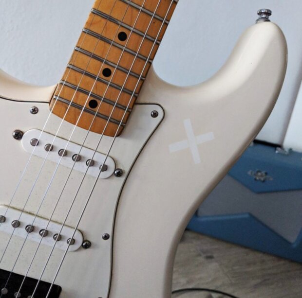 Kříž je stopa z nálepky před 7 lety. Tehdy byla kytara té barvy, která je viditelná pod touto nálepkou.