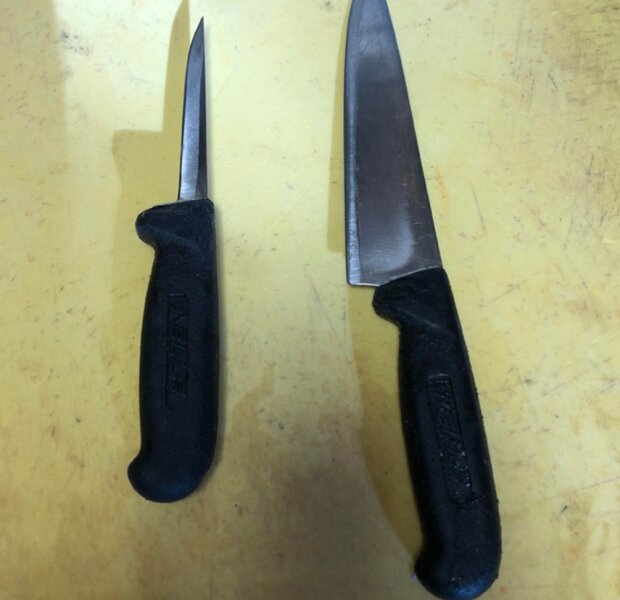 Dva nože stejného modelu, ale jeden byl málo používán, ale druhý pěkně pracoval v profesionální kuchyni