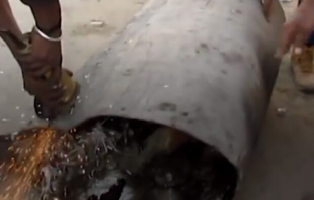 Rozřízly sud a potom psa velmi opatrně vytáhli. Byl tak vyčerpaný, že nemohl otevřít oči.