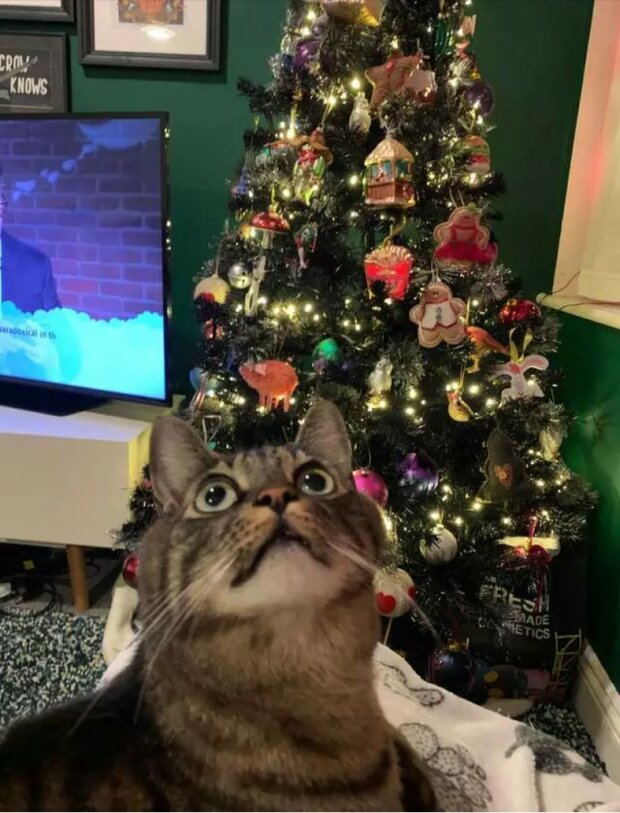 Před několika dny seděla žena v křesle vedle vánočního stromečku a odpočívala. Najednou ucítila, že v místnosti není sama. Okamžitě se rozhlédla, ale Lucifera nikde neviděla. Nakonec si však záludného kocoura všimla. Byl docela blízko.