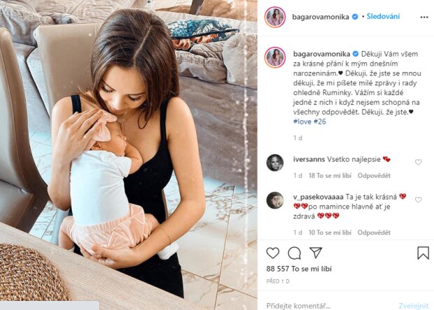 Monika 5. června oslavila své 26. Narozeniny. Přidala také fotku, kde ve svých náručích drží dceru a pod fotkou napsala poděkování „Děkuji Vám všem za krásná přání k mým dnešním narozeninám“.