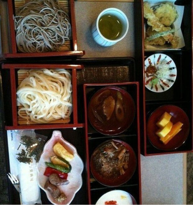 Různé nudle, zelenina, maso, ryby, polévka, ovoce.
