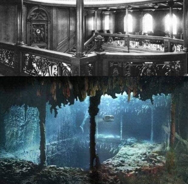 12. Fotografie z hlavního schodiště na Titaniku před jeho potopením a po více než 100 letech.