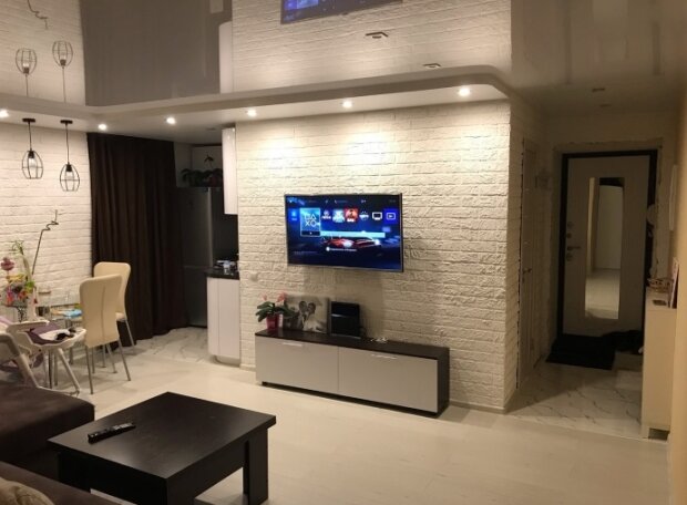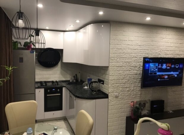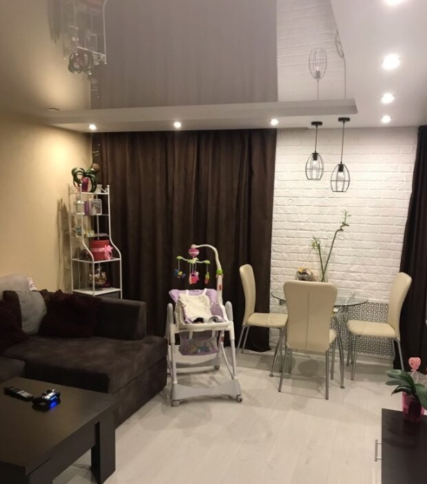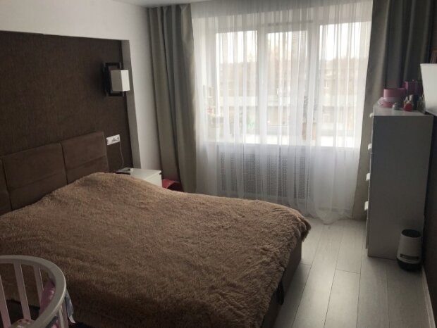 Byt má světlé stěny, strečové stropy, lesklé ložní prádlo, tmavý nábytek - to vše vizuálně rozšiřuje prostor.