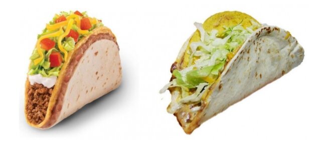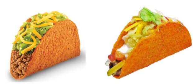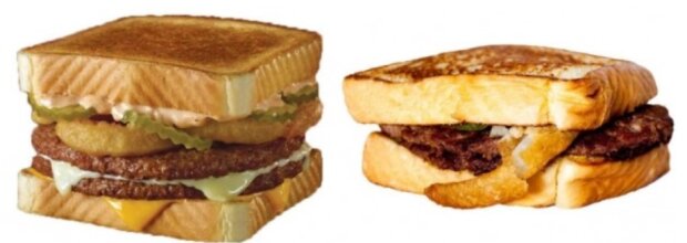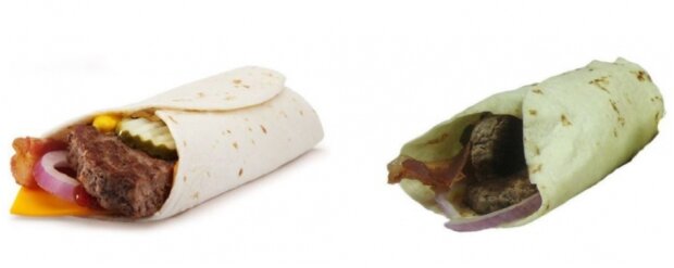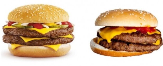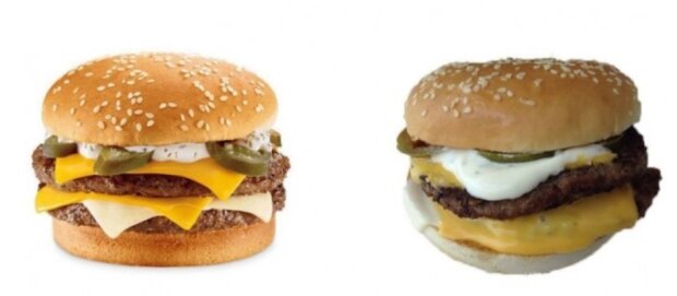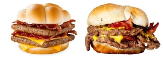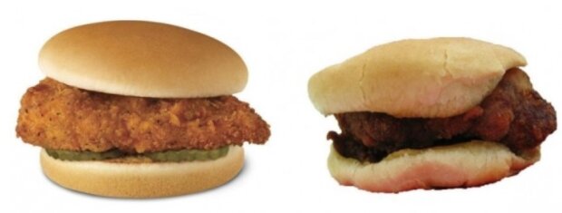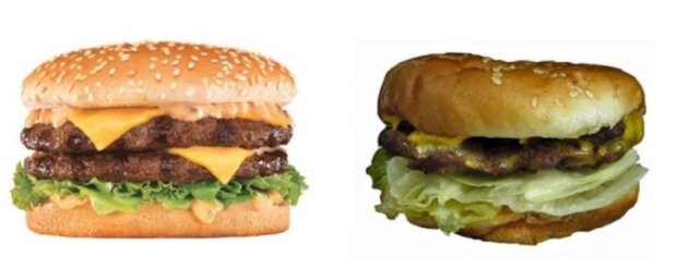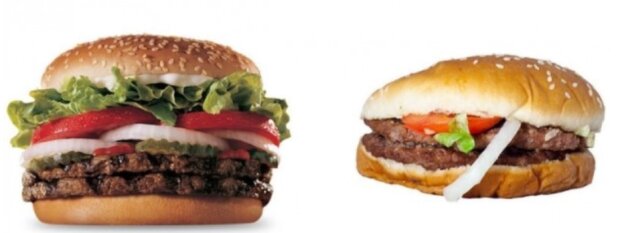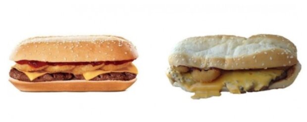 Srovnávací fotografie jídel rychlého občerstvení, jak je znázorněno na obrázku, a jak skutečně vypadají.