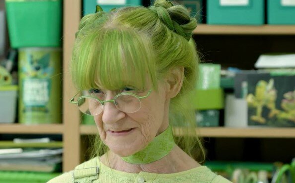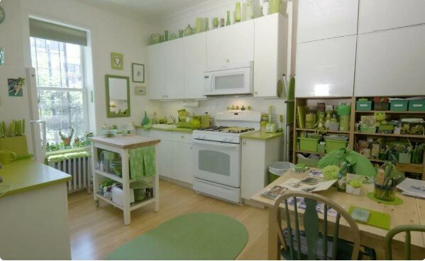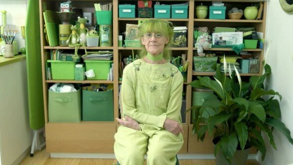 Také 76letá umělkyně používá řasenku na vlasy barvy trávy. Mnoho věcí v jejím domě je harmonicky kombinováno se vzhledem hostesky: stěny, koberce, obrazové rámy atd.