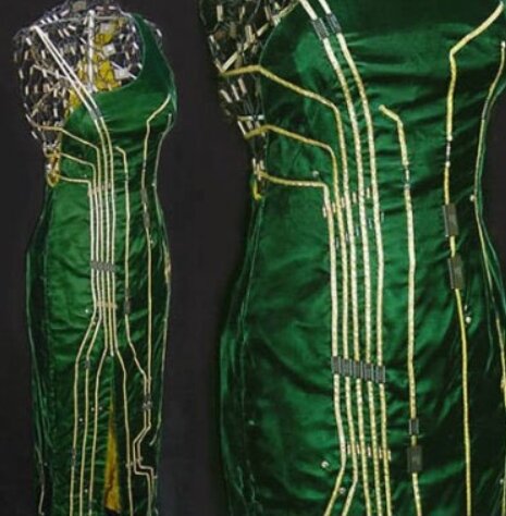 Šaty vyrobené z gumových rukavic. Pravděpodobně při vytváření takových šatů byla nějaká zpráva