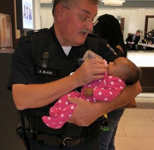 Policista krmil toto dítě, zatímco sanitka dávala její matku na nosítka.