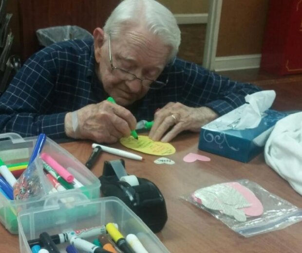 „Můj 92letý dědeček kreslí blahopřání pro mou 93letou babičku.“