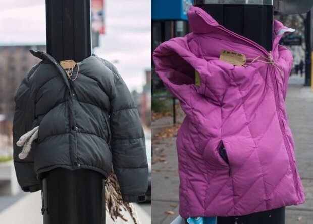 Děti v Kanadě pomáhají bezdomovcům překonat zimu tím, že nechávají bundy na sloupech. Na bundách jsou poznámky: „Nikdo mě neztratil. Pokud je ti zima, obleč si mě.“