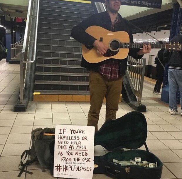 „Pokud jste bezdomovci nebo potřebujete pomoc, vezměte si tolik, kolik potřebujete (já tu jen hraji).“