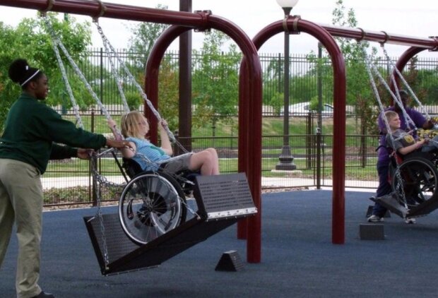 Speciální houpačka pro děti na invalidním vozíku na hřišti