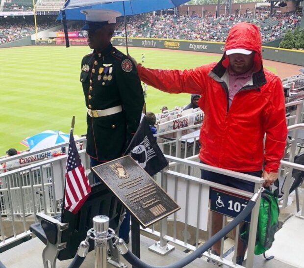 Na Memorial Day drží fanoušek deštník nad důstojníkem.