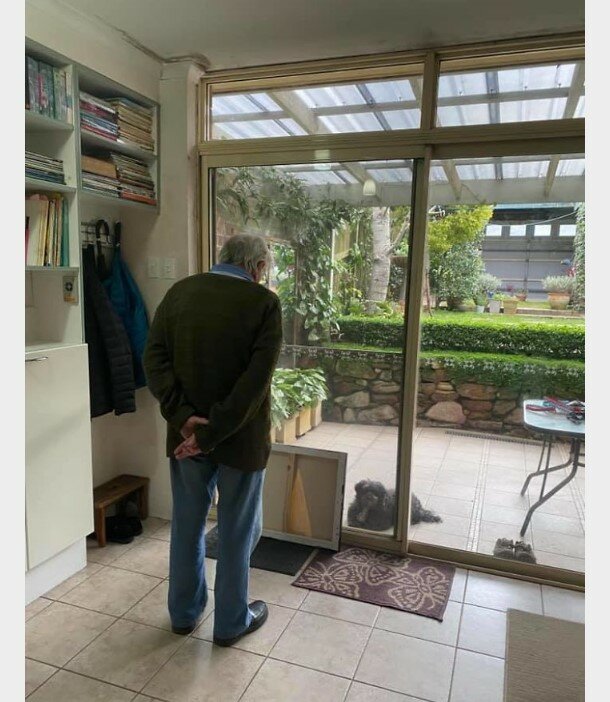 "Psi sousedů přicházejí k domu mého dědečka a je velmi smutný, že je nemůže pustit dovnitř. Proto Děda obveseluje psy»