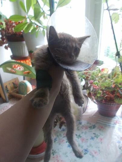 Ukázalo se, že to byla holka. Prst zvířete byl zraněn a ocas byl z neznámého důvodu odříznut. Je možné, že si krutí lidé vysmívali kotě, a pak ho hodili na zábradlí.