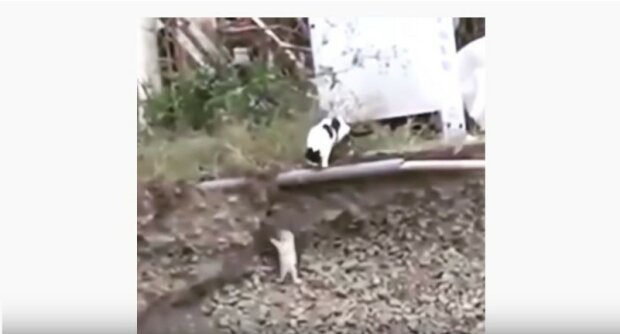 Jakmile si kočka všimla, že má štěně vážné potíže, okamžitě mu přispěchala na pomoc. Udělala vše pro to, aby mu pomohla co nejrychleji. Když viděla jeho neúspěšné pokusy dostat se ven, musela jednat. Ve chvíli, kdy chtělo skočit, převalilo se na bok. Docházely mu síly. Kočka statečně skočila do příkopu a vytáhla ho. Jak dojemné!