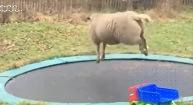 To, co dělá, je chichot. Nejprve vidíme ovce na trampolíně. Vypadá neuvěřitelně nadšená. A skáče, aniž by se zastavila.