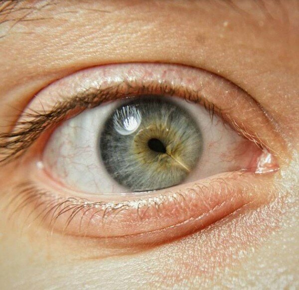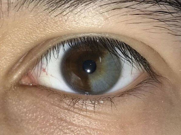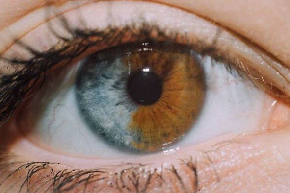 Dvoubarevné oko. Tato mutace se nazývá sektorová heterochromie a může být zděděna nebo získána v důsledku zranění