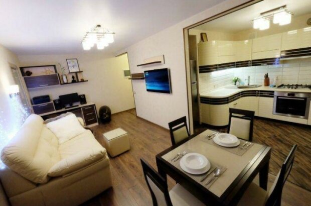 Bylo rozhodnuto okamžitě provést generální opravu. Pro zvětšení prostoru v bytě se mladý muž rozhodl propojit kuchyň s halou.