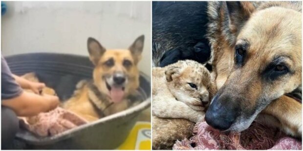 Zaměstnanci parku „Bílý lev“ ve Vladivostoku přiřadili dvě lvíčata fence německého ovčáka Sandře, která má také své vlastní štěně. Kupodivu, ale Sandra přijala velké kočky jako své vlastní.