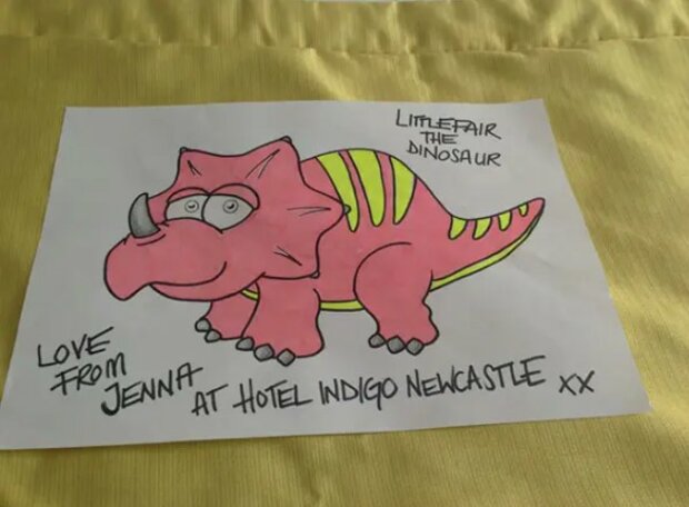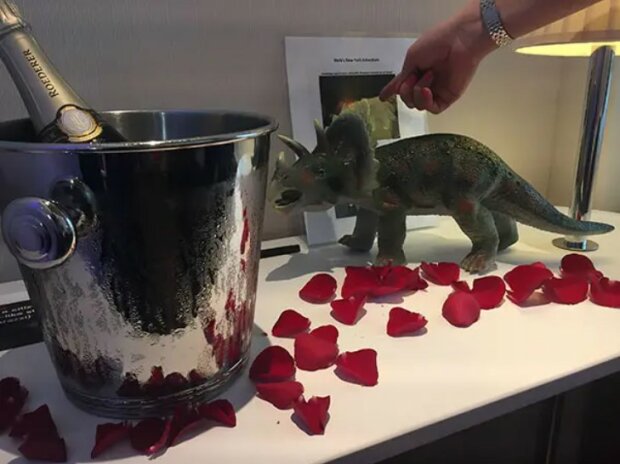 "Když jsem si před několika měsíci rezervoval hotel, nechal jsem pár vtipných přání ... šampaňské, růže a plastový dinosaurus."