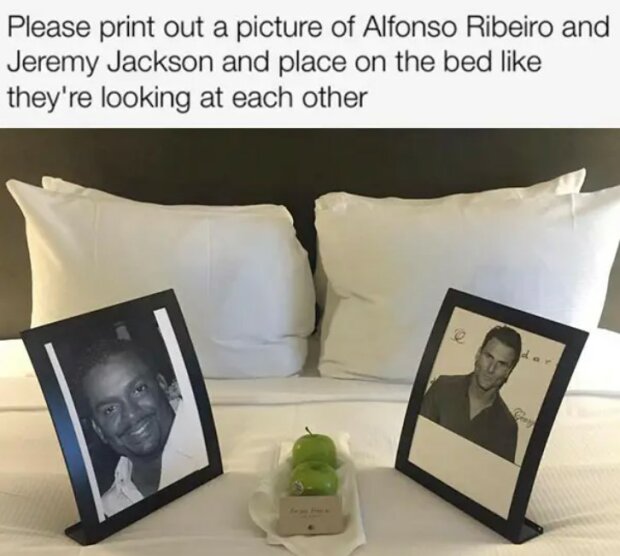 „Dej prosím fotku Alfonsa Ribeira a Jeremyho Jacksona na postel, aby vypadali, jako by se na sebe dívali.“
