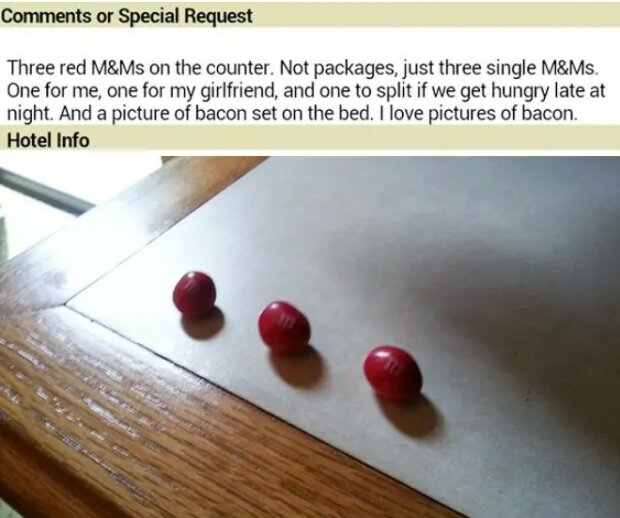 Tento hotel věnuje pozornost i nejmenším přáním klientů. Prosba zní: "tři M & M' S červené bonbóny jsou na stole. Ne balení, ale tři samostatné M & M. Jeden pro mě, jeden pro moji přítelkyni a jeden k jídlu na polovinu, pokud budeme mít hlad pozdě v noci. Obrázek slaniny na posteli. Miluju fotky slaniny."