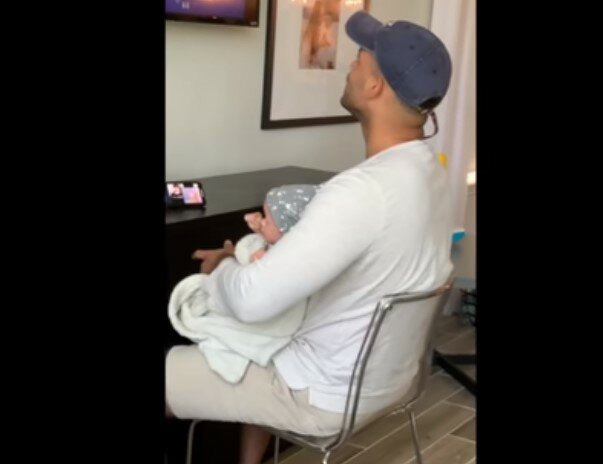 Manželka předává manželovi dítě a ten si neuvědomuje, že se něco děje. Ale okamžik uvědomění přesně riskuje, že se stane memem.