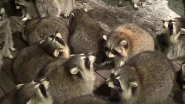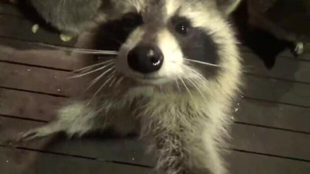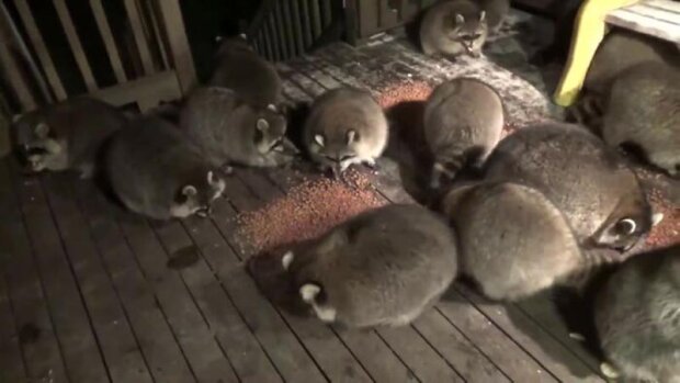 Ve videu James vyjde na verandu svého domu a nakrmí dav divokých mývalů.
