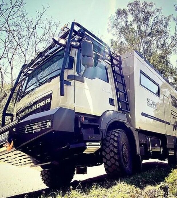 V dodávce je pohodlný nábytek, sprcha, WC, kuchyň, 4 televize. Nádrže na vodu o objemu 1000 l. Na střeše je lednice.