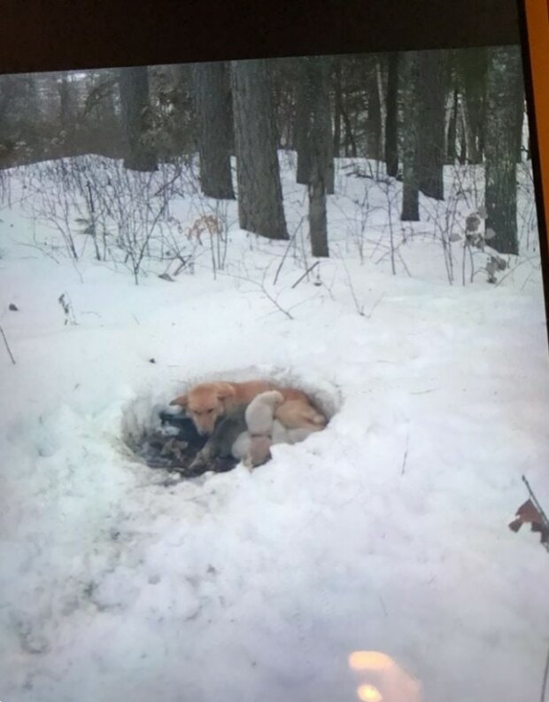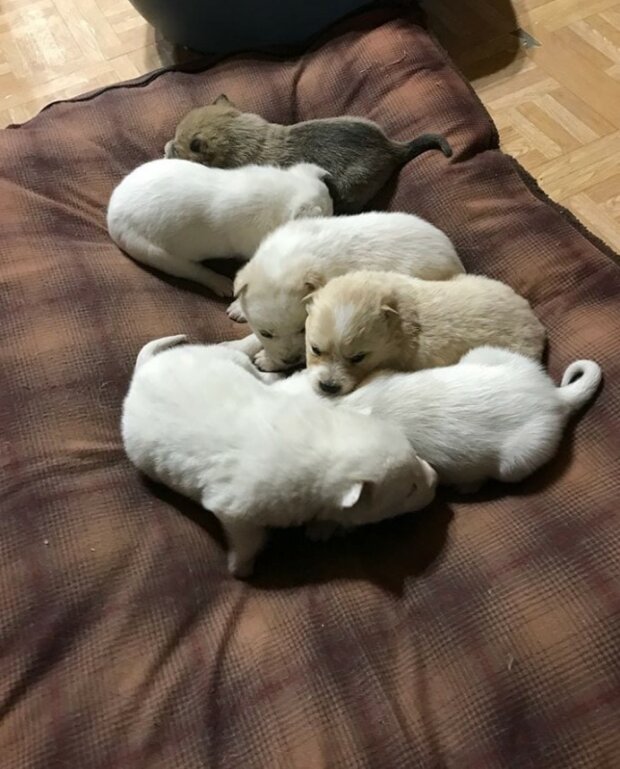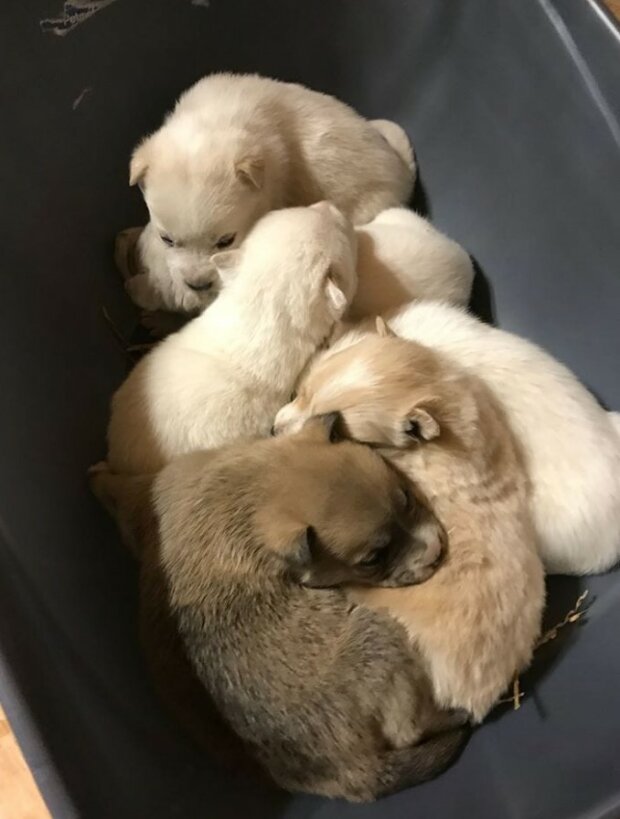 Náhodní cestovatelé našli tento dojemný nález. Matka s mláďaty byla okamžitě poslána do místního útulku Red Lake Rosie ' s Rescue. Zaměstnanci útulku prohlédli štěňata, zjistili, že jsou už asi tři týdny a celou dobu byli v chladu.