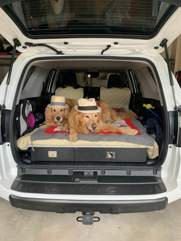 Změnili jsme naše auto na 4Runner kvůli jeho zadnímu oknu, které se sklání dolů. Můj manžel také vytáhl zadní sedadlo, aby vytvořil více prostoru pro naše 2 Goldens Jake & Zoey.