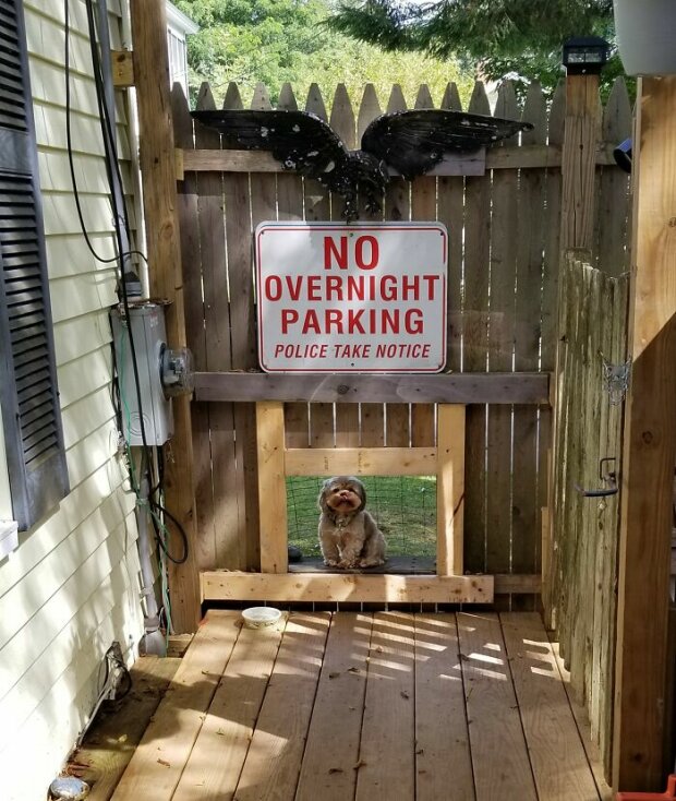 Nechala jsem svého přítele vyříznout díru v plotu a odložit plošinu, aby můj pes mohl stále sledovat, jak si děti hrají, aby viděl ostatní psy. Není to nic fantastického, ale Eddie to miluje