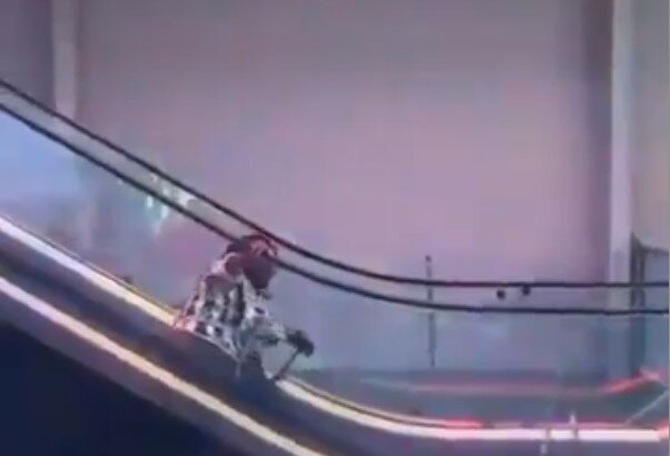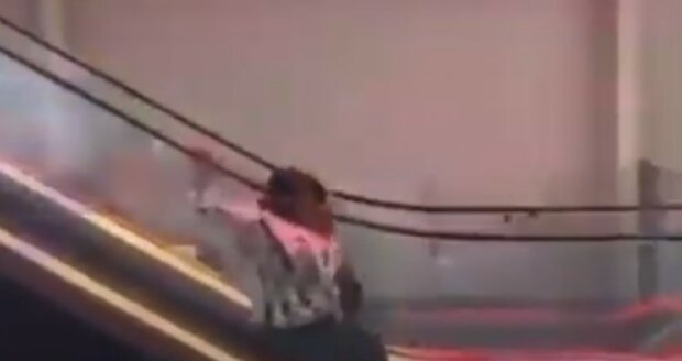 Lidé jezdí na eskalátoru v různých pózách, často taková zábava končí pády.