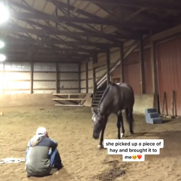 Ale přišla, jak se říká, ne s prázdnýma rukama, ale přinesla trochu sena, aby uklidnila majitelku, a začala se pokoušet zkontrolovat, zda je v pořádku.