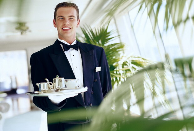 Číšník se vrací s objednávkou, vidí kočku čmárající něco na klávesnici notebooku.