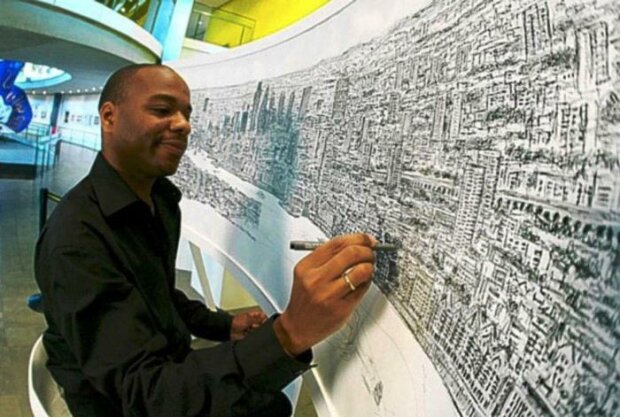 Takto namaloval panoramatický snímek Tokia, Říma a New Yorku. Ten je prezentován v podobě obřího billboardu na mezinárodním letišti Johna F. Kennedyho.