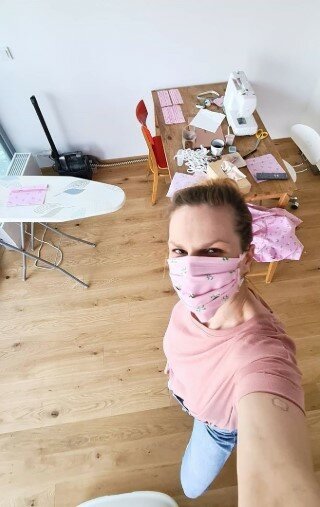 Iva Pazderková, která se věnuje stand-upu, začala šít 16. března, v den svých čtyřicátin. Na svém instagramovém účtu uvedla, že je v den svých narozenin šťastná, že si teď tak pomáháme. Moc by si přála, abychom se k sobě takhle hezky chovali i po skončení epidemie.