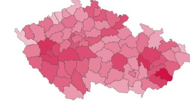 Největší počet nakažených je zatím na Prostějovsku. Bylo zde zaznamenáno asi 882 případů nákazy na 100 000 obyvatel.